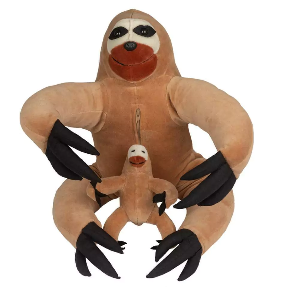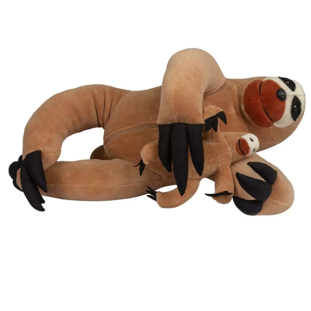 Bicho-preguiça mãe: 45cm x 27 cm x17 cm; filhote: 17cm x 14cm x 9 cm. Por ser um produto artesanal, pode haver variações nas cores do tecido. Feito em tecido antialérgico (Plush 80% algodão e 20% poliéster) e fibra proveniente de reciclagem de garrafa PET (100% poliéster).