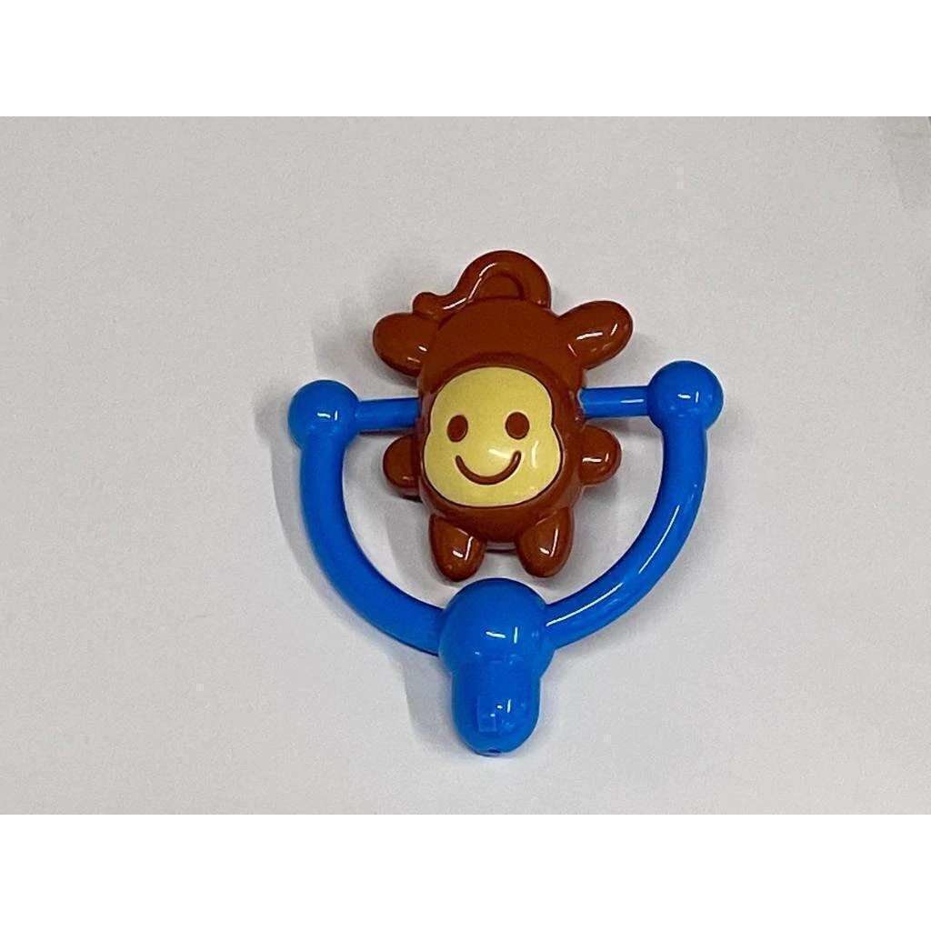 Esse conjunto vem com 4 chocalhos em formatos e animais diferentes como:leão ,sapo. macaco e um cilindro .
