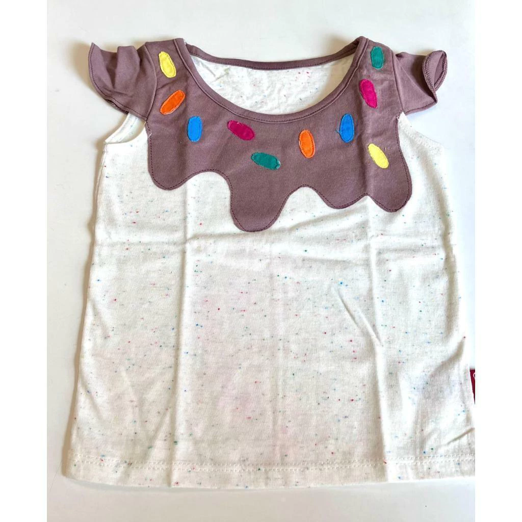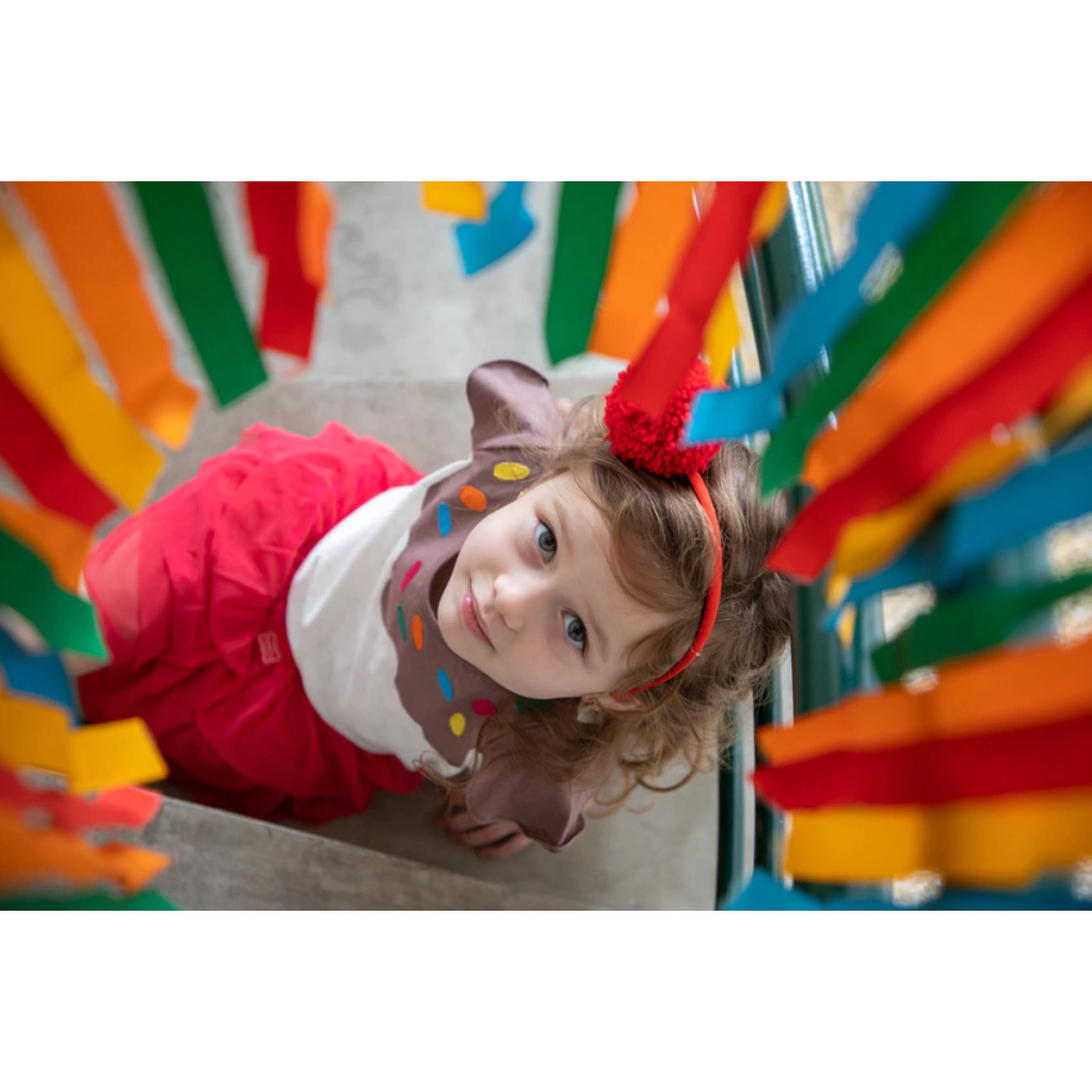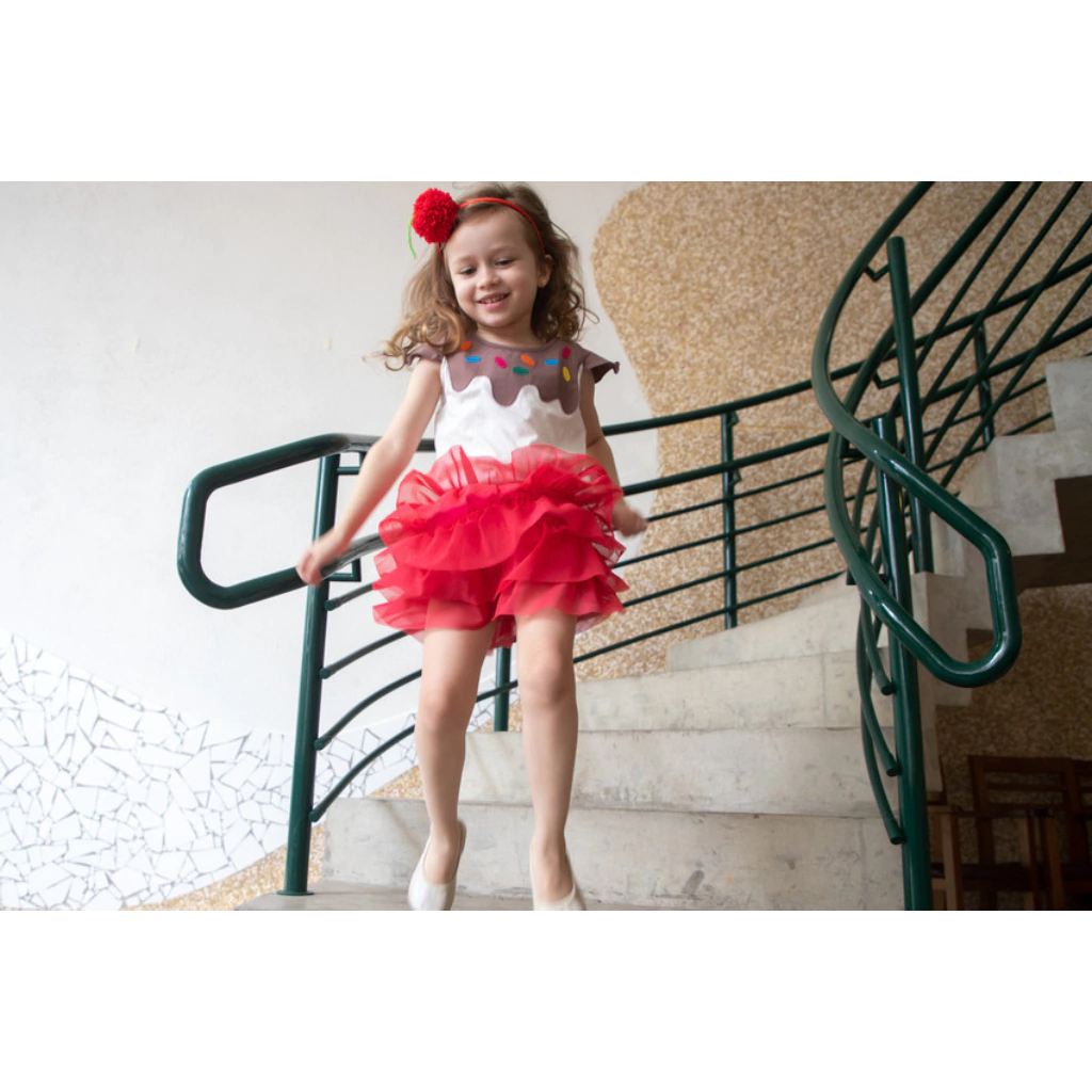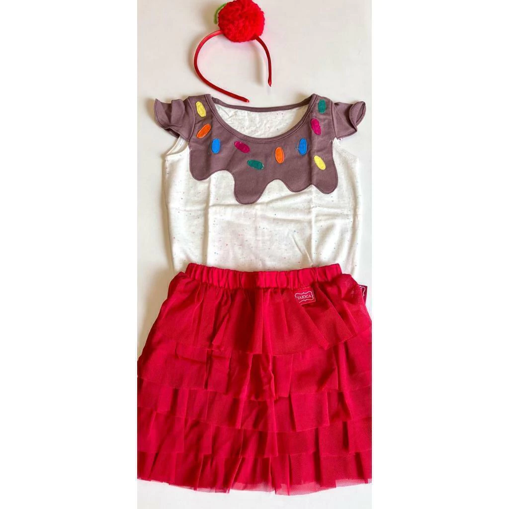 Fantasia Docinho é composta por uma Camiseta feita em algodão, Saia em tule e 1 Tiara com pompom.