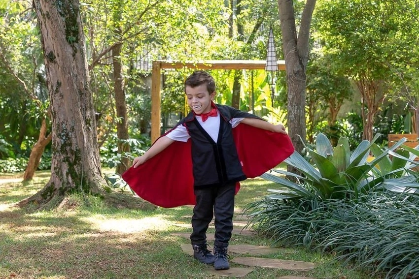 Camiseta em malha 100% algodão, com acabamento em fita de veludo. Acompanha capa dupla face em viscose, broche de gravatinha borboleta. Perfeito para as crianças brincarem de contos e histórias infantis.