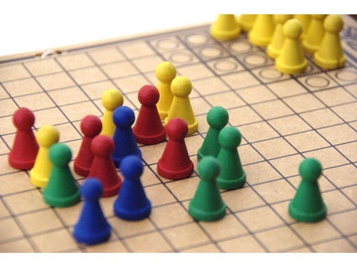 Contém: 1 tabuleiro em MDF 76 peças em madeira sendo 19 amarelas, 19 vermelhas, 19 azuis e 19 verdes folheto com regras e instruções para jogar.