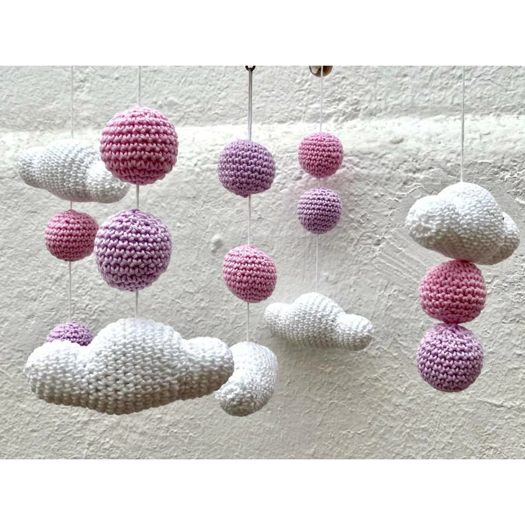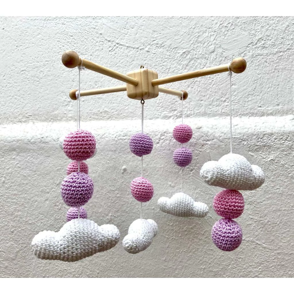 Este lindo mobile tem a temática de nuvens com bolinhas azuis ou rosas , feito na técnica de croche amigurumi é lindo e sua base feita em madeira.