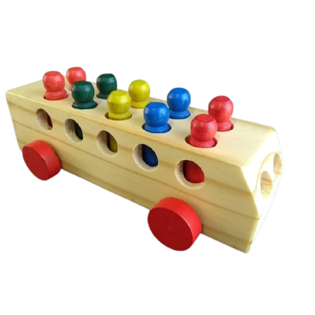 Ônibus confeccionado em madeira artesanal com pinos coloridos com tinta atóxica que encaixam, perfeito para as crianças brincarem encaixando os pinos e puxando o ônibus.