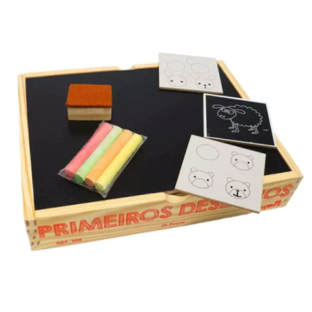 Primeiros Desenhos é uma caixa de madeira com cartões de figuras para as crianças aprenderem a desenhar.