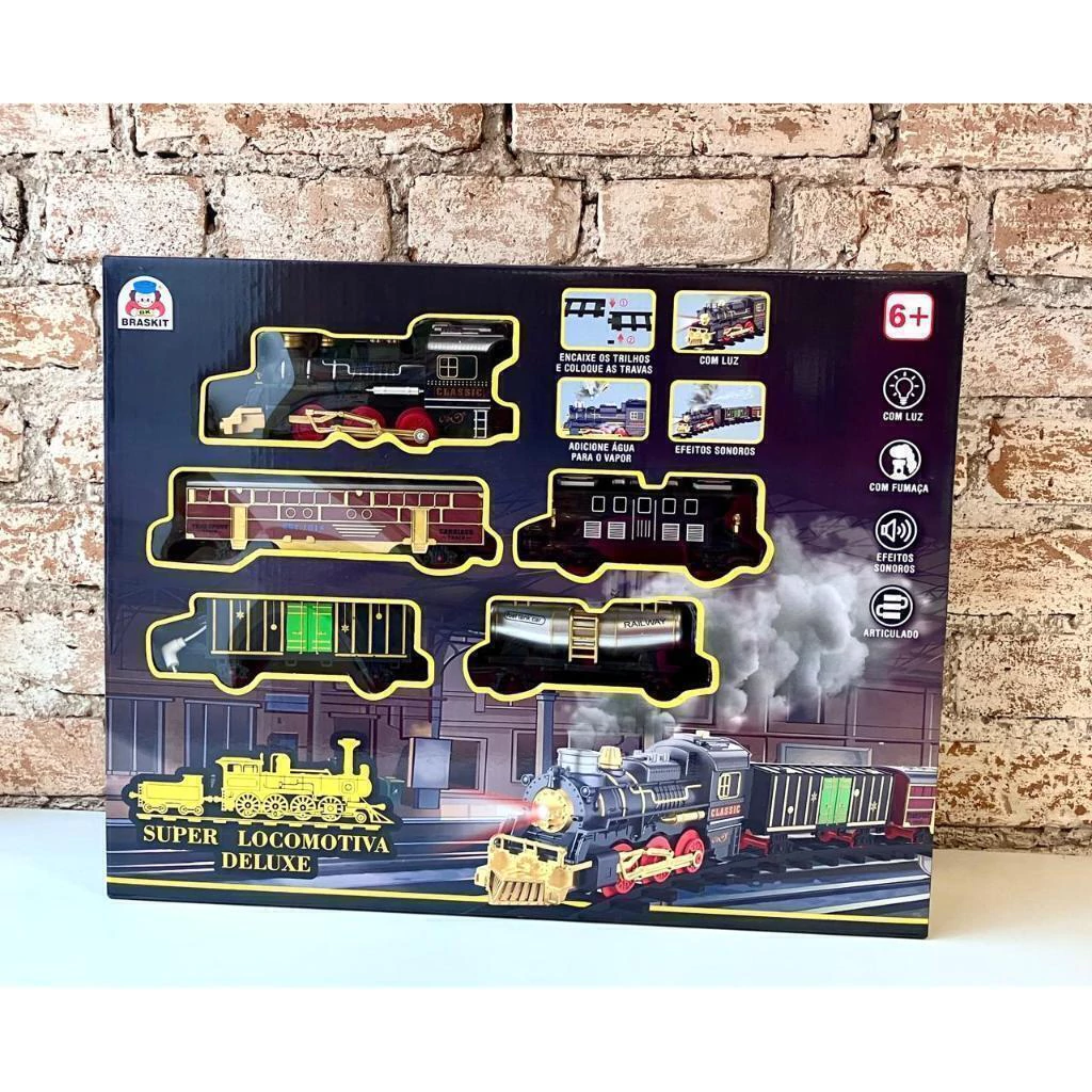 Super Locomotiva Deluxe vem com 5 vagões que percorrem o trilho , emitem som e sai fumaça.